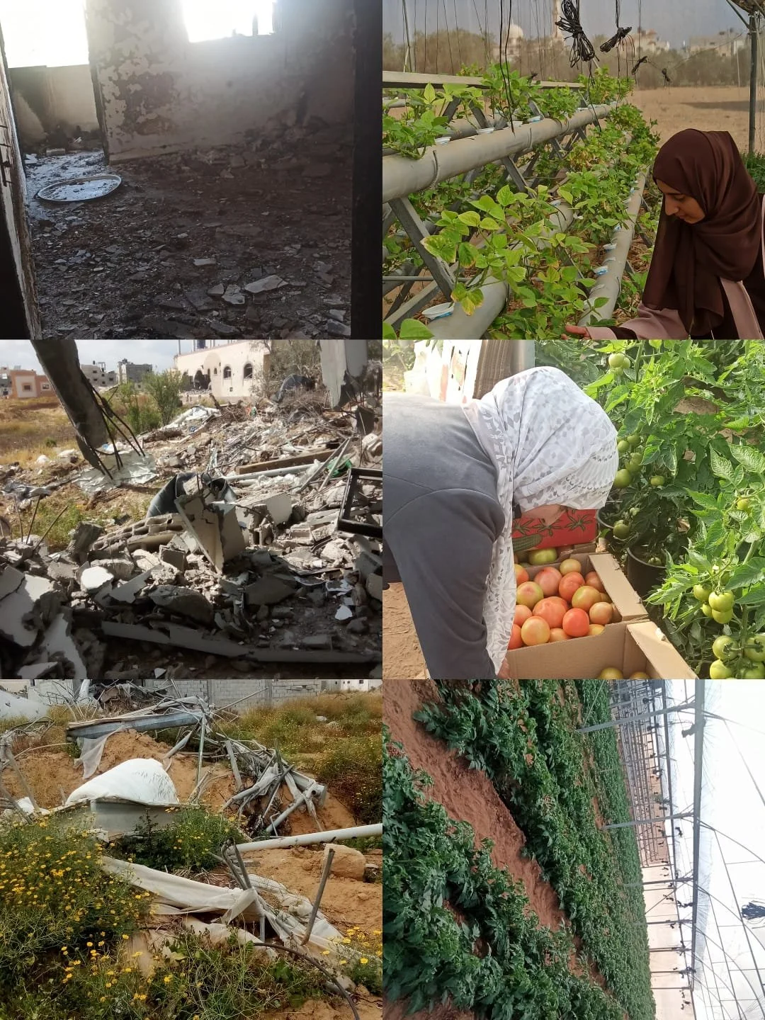 On the right you see Sawsan tending her vegetables and on the left you see the destruction of her agricultural business.